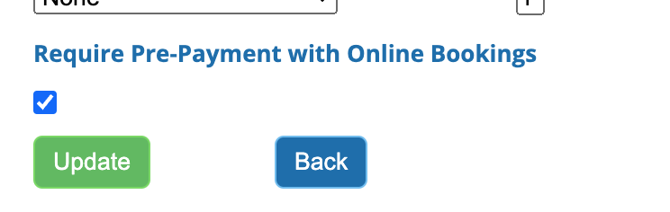 Next, head to Settings->Services. Click "Edit" for the services for which you wish to collect prepayment. Tick the "Require Pre-Payment with Online Bookings" checkbox then click Update.